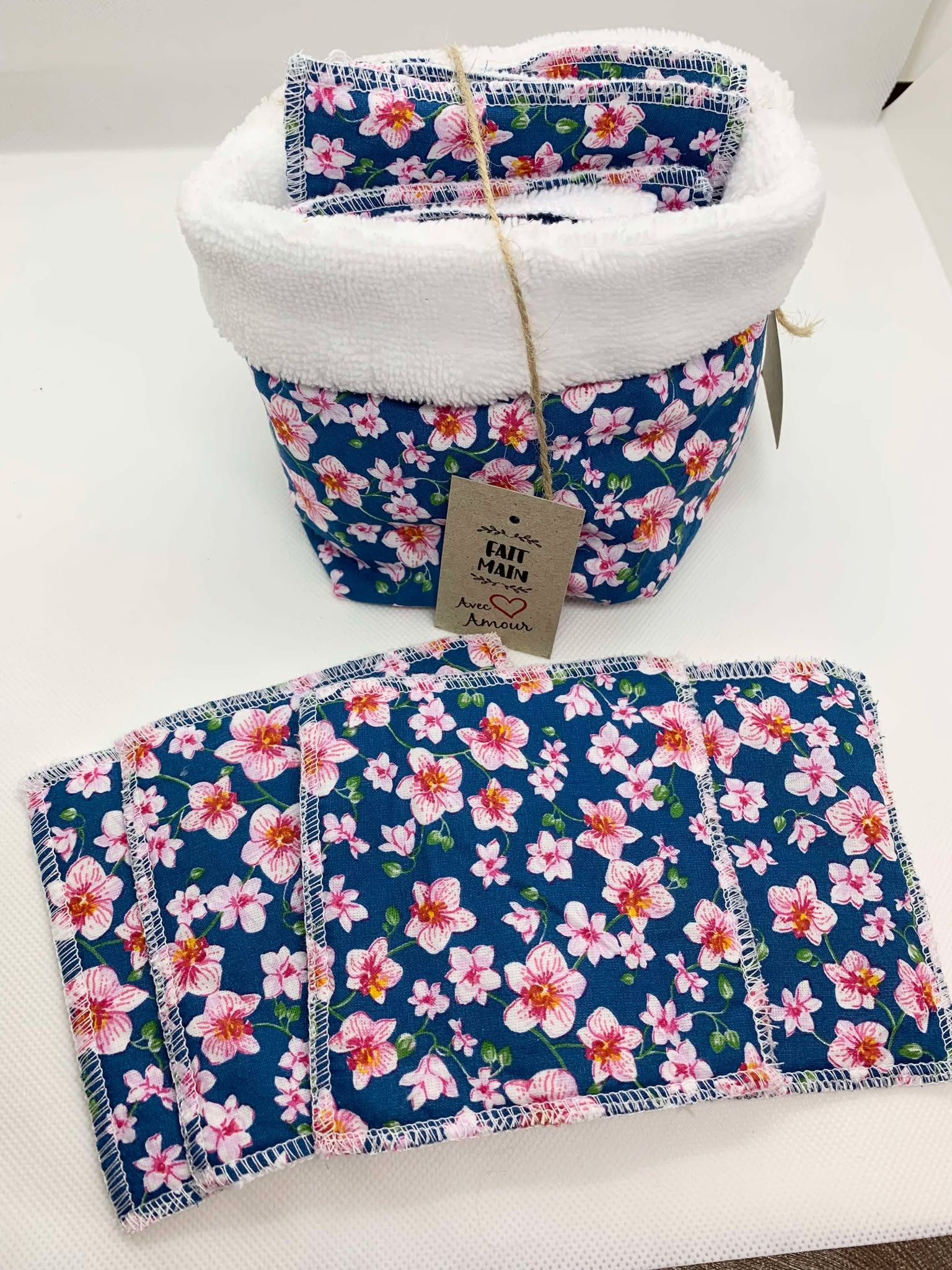 - 1 Panière avec une face coton bleu avec des fleurs roses et une face en éponge de bambou blanche