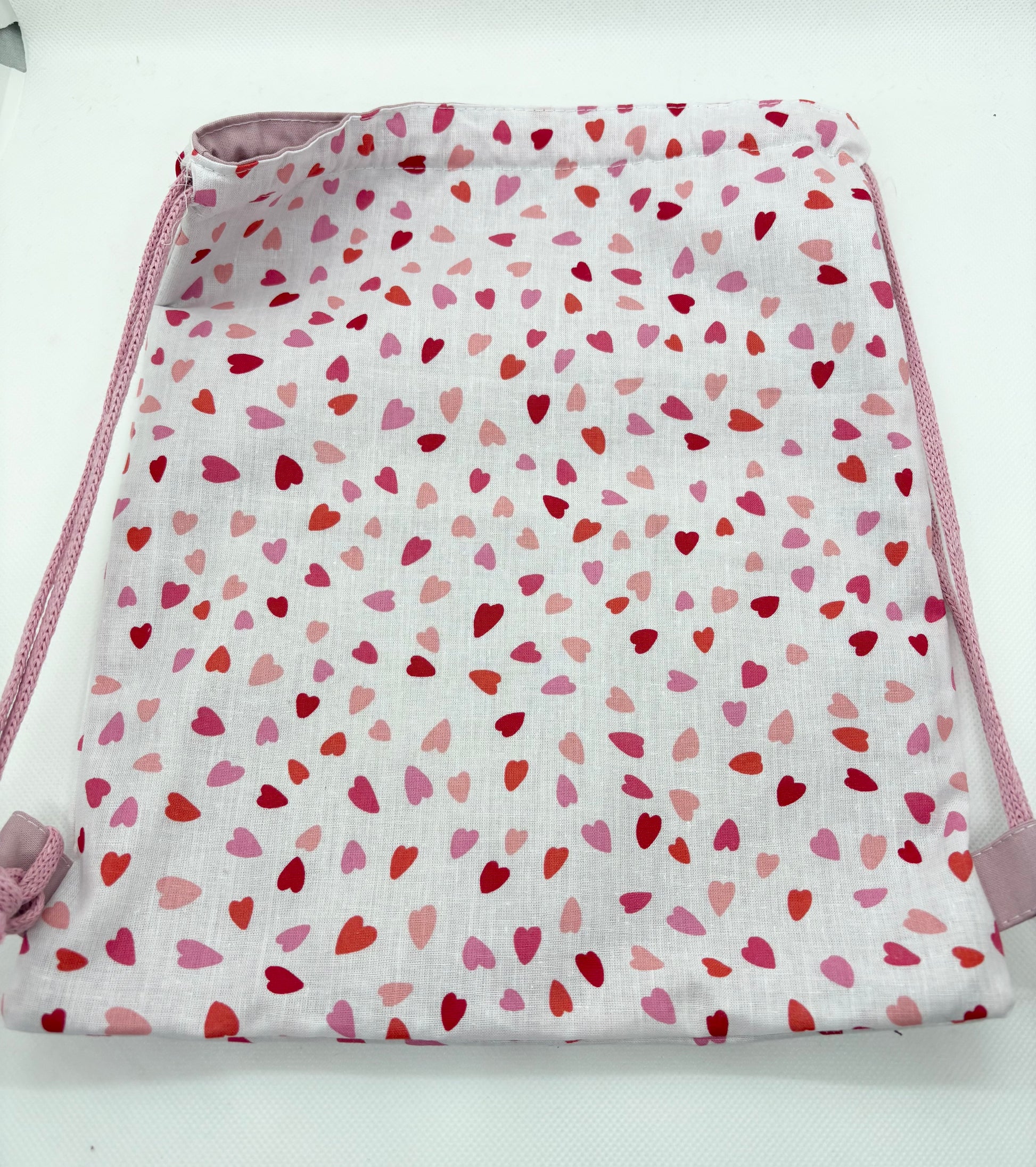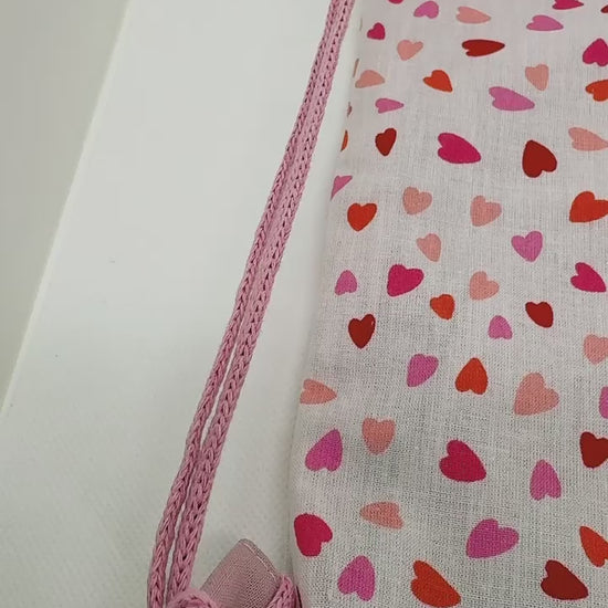 Ce joli pochon plein d'amour pour accompagner votre enfant partout ! Doux, pratique et craquant avec ses petits coeurs, il garde précieusement tous ses trésors, se porte facilement sur le dos grâce à son cordon de serrage réglable.