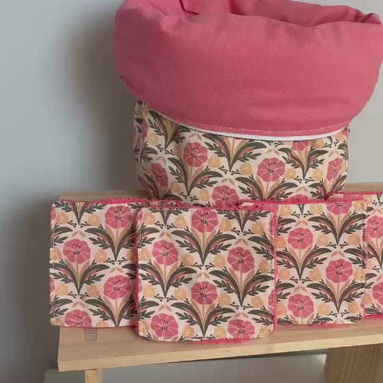 Confectionnée dans des tissus aux motifs fleuris aux teintes chaudes (rose, corail et touches orangées), cette trousse est accompagnée de 4 lingettes réutilisables assorties.